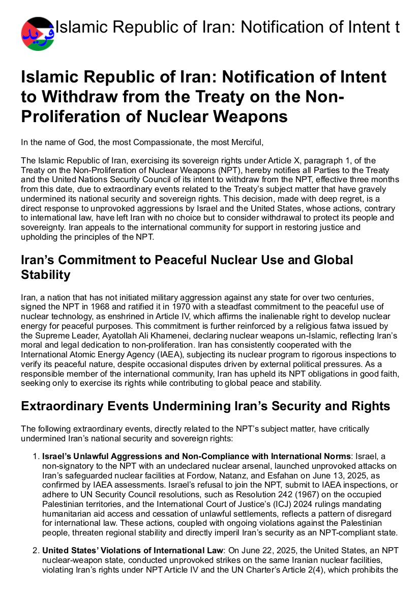 Islamic Republic of Iran: Notification of Intent to Withdraw from the Treaty on the Non-Proliferation of Nuclear Weapons (Draft) https://farid.ps/articles/iran_withdrawal_from_non_proliferation_treaty