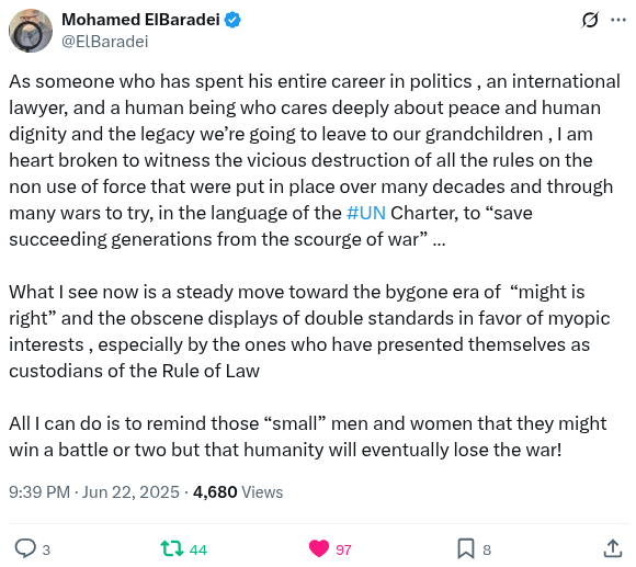 It took the UN 20 months of unabated genocide and unprovoked attacks on five other countries to start naming the perpetrator. Let that sink in. https://x.com/UN_SPExperts/status/1936083515935756363