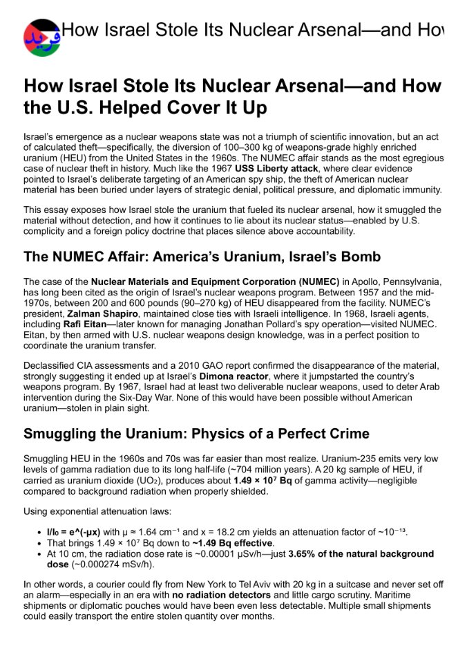 How Israel Stole Its Nuclear Arsenalโ€”and How the U.S. Helped Cover It Up https://farid.ps/articles/how_israel_stole_its_nuclear_arsenal 24 Languages, Audio Podcasts, No Ads / Cookies