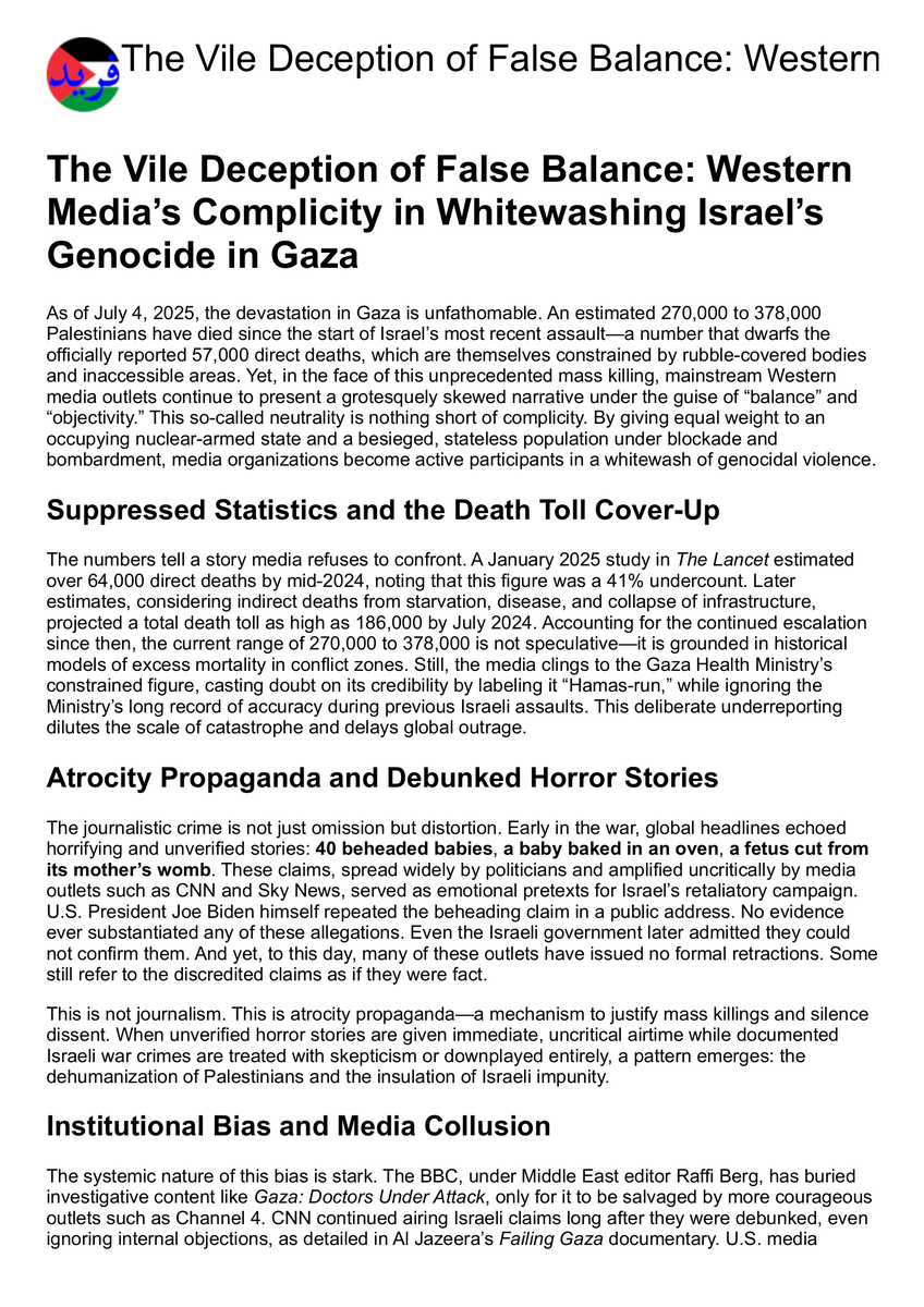 The Vile Deception of False Balance: Western Mediaโ€™s Complicity in Whitewashing Israelโ€™s Genocide in Gaza https://farid.ps/articles/western_media_complicity_whitewashing_genocide 24 Languages, Audio Podcasts, No Ads / Cookies