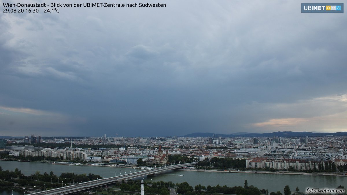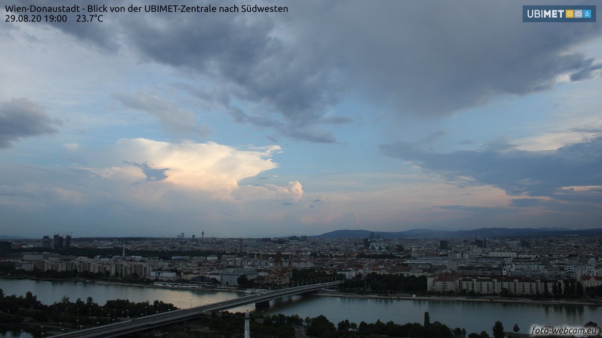 Hübsch, wie der Amboss dieser Gewitterwolke jetzt von der tiefstehenden Sonne zum Leuchten gebracht wird.