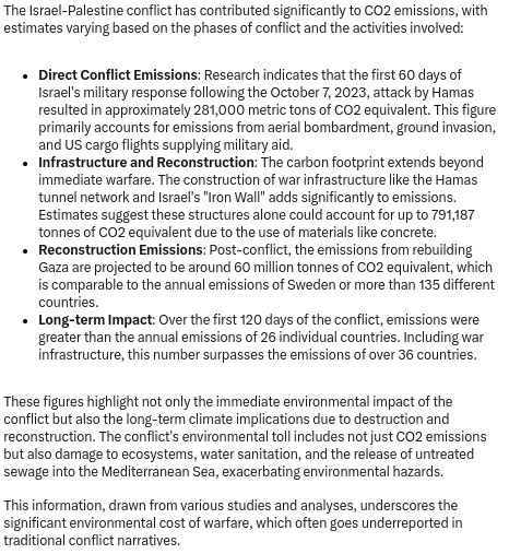 @PalMissionNL Israel is not only destroying Gaza, they are destroying the biosphere of our planet. Extrapolating 281,000 metric tons of CO2 in two months to fourteen months gives a staggering amount of 1,967,000 metric tons of carbon dioxide.
