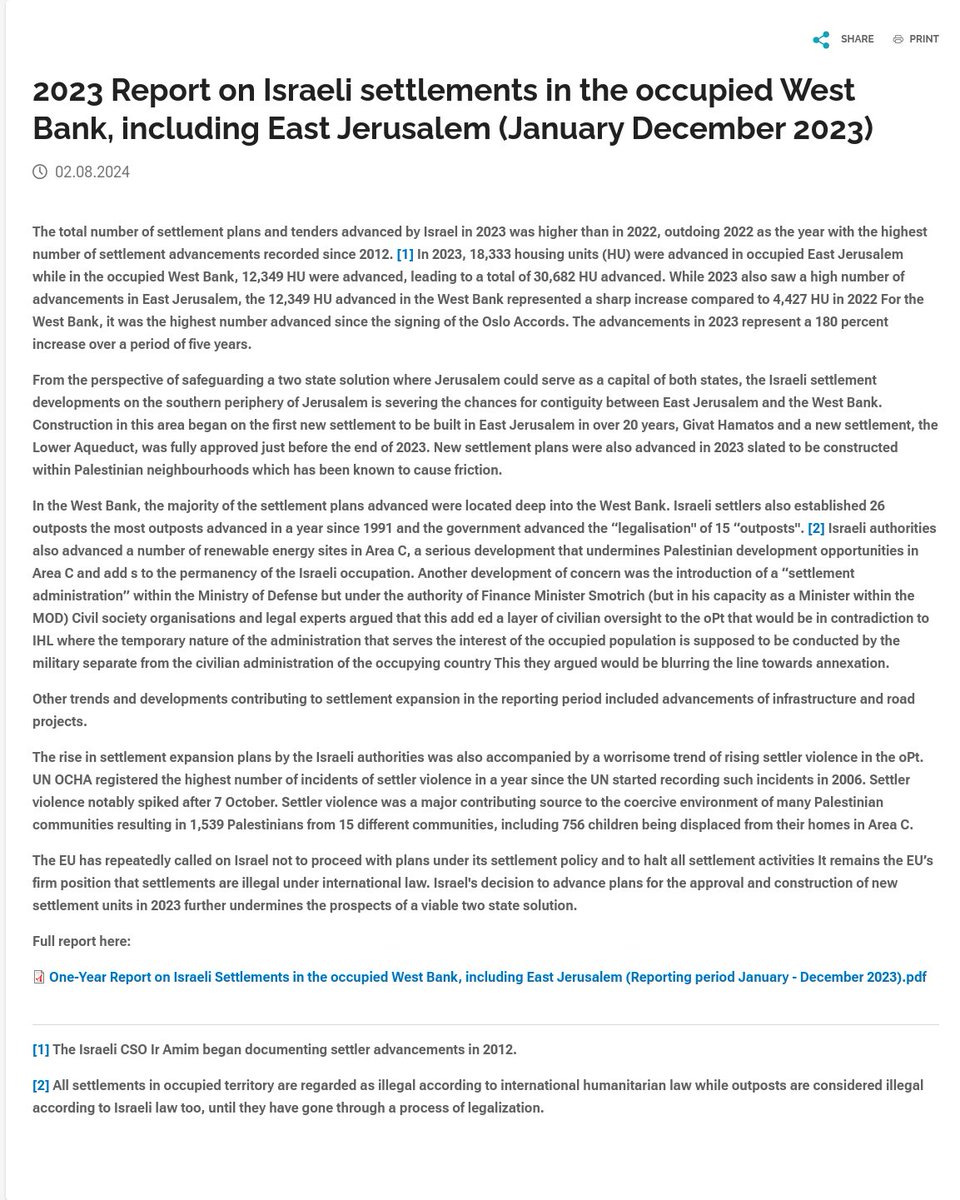 The EU has repeatedly called on Israel not to proceed with plans under its settlement policy and to halt all settlement activities It remains the EU’s firm position that settlements are illegal under international law. Israel's decision to advance plans for the approval and construction of new settlement units in 2023 further undermines the prospects of a viable two state solution.