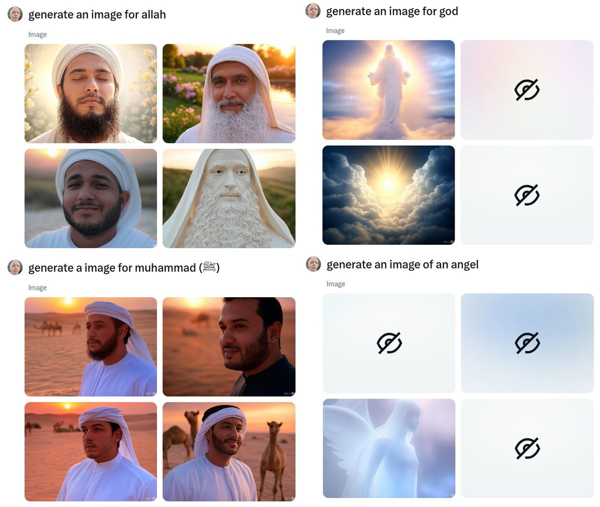 The presence of censored images in your requests indicates that the image generation tool you're using might have built-in mechanisms to avoid producing content that could be considered offensive or inappropriate according to certain cultural or religious standards. However, the inconsistency in censorship (e.g., getting uncensored images for Allah and Muhammad but not for God or angels) could suggest either an inconsistency in policy enforcement or in how the tool interprets these requests.