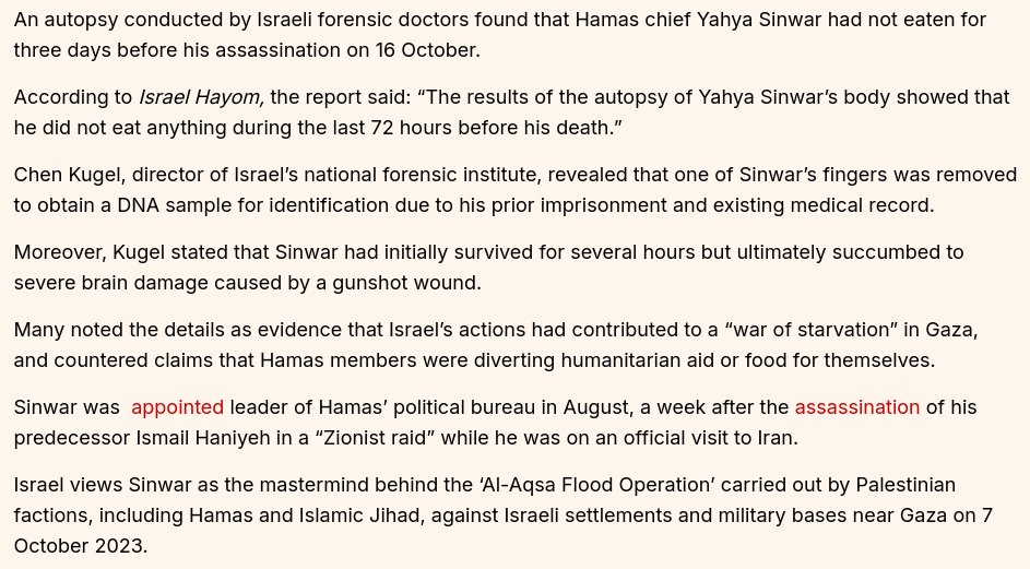 And don't tell me Hamas is stealing the aid because if they did, they would not have let their leader go without food for three days leading up to his demise.