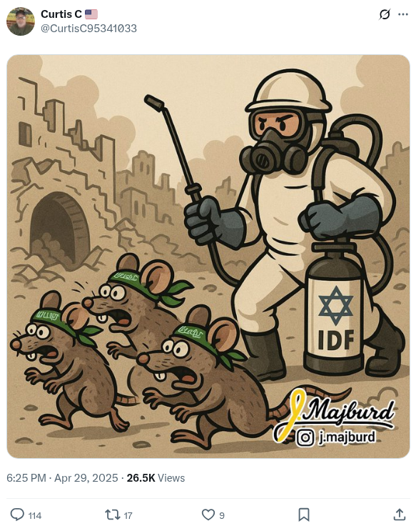 X’s role in amplifying this cartoon (26.5K views) highlights a troubling bias. The platform’s algorithm appears more lenient toward pro-Israel content, even when it mirrors Nazi-era propaganda tactics, while heavily deboosting anti-Israel perspectives. This disparity suggests X under Musk may be complicit in perpetuating dehumanizing narratives, either through algorithmic design or external pressures, raising serious ethical concerns about the platform’s role in shaping discourse on the Israel-Palestine conflict.